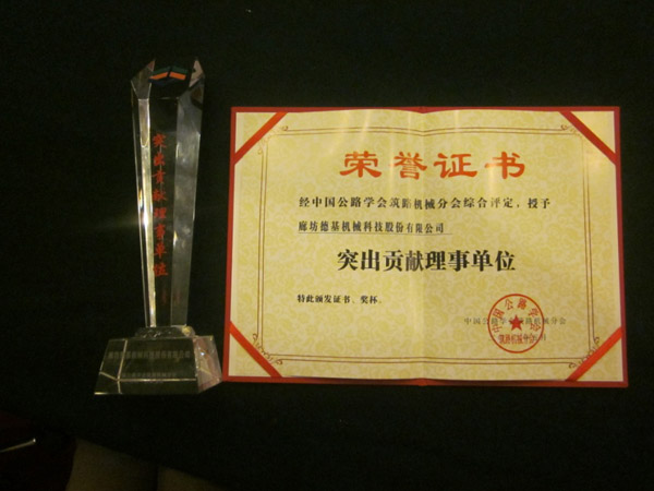 5月14日,在北京召開的中國公路學會築路機械分會第七屆會員代表大會上,廊坊德基機械科技股份有限公司(“德基機械”)榮膺突出貢獻理事單位,圖片為大會授予的榮譽證書及獎杯。