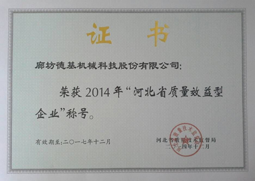 2014年12月,德基機械榮獲“河北省質量效益型企業”的稱號,並於2015年3月獲發榮譽證書。