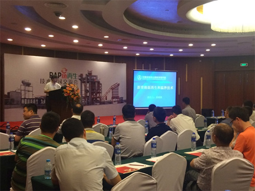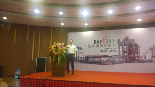 會議由德基機械營銷中心常務副總經理李彤先生為大會致辭。首先由交通部公路科學研究院黃頌昌教授向與會來賓介紹“國內外瀝青再生技術的現狀及發展”。隨後,德基機械研發中心副主任於洪林先生就“RAP熱再生”做了專題報告,重點介紹了德基機械的“整體式瀝青混合料攪拌設備”(下稱“整體式設備”)。該“整體式設備”摒棄拚湊再生功能的傳統思路,將再生作為攪拌設備的標準配置,是專為再生而生的瀝青攪拌設備。在設計理念上,“整體式設備”的拌鍋位於設備的中間位置,確保生產所需回收料和新骨料均可由各自的計量鬥直接進入拌鍋,此外,相對於常規攪拌設備,“整體式設備”采用了大一號的拌鍋,即在延長攪拌時間的情況下也能保證設備的產量。