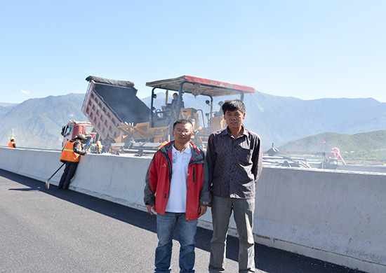 負責該項工程A標(biao)段(duan)的(de)中(zhong)交(jiao)第(di)一(yi)公(gong)路(lu)局(ju)工(gong)程(cheng)有(you)限(xian)公(gong)司(si)宋(song)經(jing)理(li)帶(dai)我(wo)們(men)進(jin)入(ru)正(zheng)在(zai)進(jin)行(xing)麵(mian)層(ceng)施(shi)工(gong)的(de)橋(qiao)梁(liang)現(xian)場(chang)。機(ji)器(qi)轟(hong)鳴(ming),塵(chen)土(tu)微(wei)揚(yang),瀝(li)青(qing)路(lu)麵(mian)正(zheng)在(zai)緊(jin)張(zhang)鋪(pu)設(she)中(zhong),黑(hei)色(se)路(lu)麵(mian)穿(chuan)過(guo)河(he)流(liu)向(xiang)前(qian)延(yan)伸(shen),通(tong)向(xiang)山(shan)的(de)另(ling)一(yi)麵(mian)。