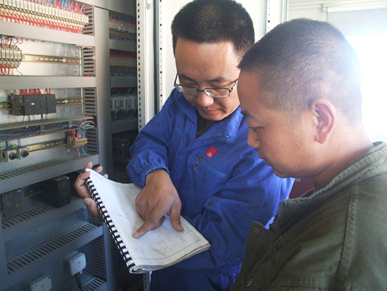 在史經理和記者交流的同時,控製室內的德基機械服務工程師陳青鬆與瀝青拌合站操作手正在進行細致交流,仔細檢查設備使用情況。
