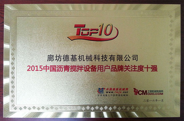 2016年1月,由中國路麵機械網和工程機械電商網,依據2015年全年內用戶對所有瀝青攪拌設備品牌、產品的瀏覽量及在線詢價次數而生成的品牌關注度指數,共同評選出“2015中國瀝青攪拌設備用戶品牌關注度十強”榜單。德基機械以較高關注度入圍並位列該榜單第二名。