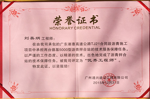 劉英炳“優秀服務工程師”稱號榮譽證書