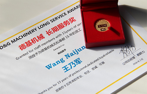在(zai)德(de)基(ji)機(ji)械(xie)長(chang)期(qi)發(fa)展(zhan)中(zhong),還(hai)有(you)一(yi)批(pi)一(yi)直(zhi)默(mo)默(mo)耕(geng)耘(yun)的(de)員(yuan)工(gong),把(ba)自(zi)己(ji)人(ren)生(sheng)大(da)好(hao)年(nian)華(hua)奉(feng)獻(xian)給(gei)了(le)公(gong)司(si),這(zhe)其(qi)中(zhong)包(bao)含(han)了(le)無(wu)比(bi)的(de)信(xin)任(ren)和(he)忠(zhong)誠(cheng)。隨(sui)著(zhe)德(de)基(ji)機(ji)械(xie)的(de)穩(wen)步(bu)發(fa)展(zhan),伴(ban)隨(sui)公(gong)司(si)成(cheng)長(chang)的(de)老(lao)員(yuan)工(gong)越(yue)來(lai)越(yue)多(duo),公(gong)司(si)每(mei)年(nian)會(hui)向(xiang)為(wei)公(gong)司(si)服(fu)務(wu)滿(man)十(shi)年(nian)、十五年、二十年及以上的員工進行表彰,以示感謝。