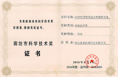 ★德基機械榮獲廊坊市科技局頒發的“廊坊市科學技術進步獎”一等獎。