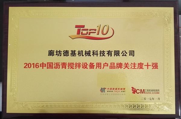 2017年1月3日,中國路麵機械網和工程機械電商網在北京發布了“2016年中國工程機械用戶品牌關注度排行榜”。廊坊德基機械科技有限公司榮登“2016中國瀝青攪拌設備用戶品牌關注度十強”榜單。