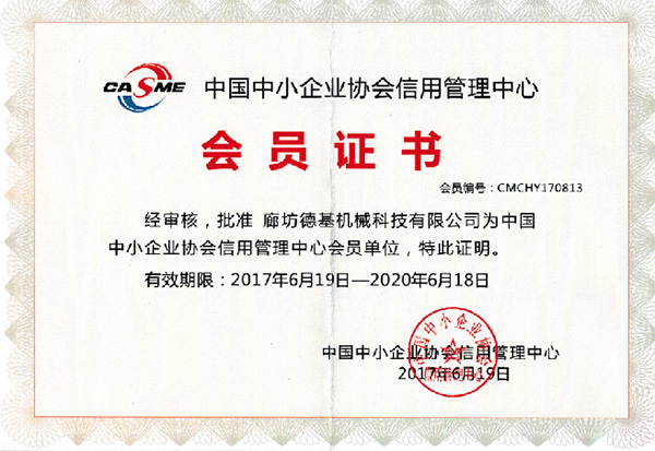 近日,德基機械榮獲中國中小企業協會授予的AAA級《企業信用等級證書》——企qi業ye綜zong合he信xin用yong的de最zui高gao等deng級ji。同tong時shi,德de基ji機ji械xie還hai成cheng為wei中zhong國guo中zhong小xiao企qi業ye協xie會hui信xin用yong管guan理li中zhong心xin的de會hui員yuan單dan位wei。中zhong國guo中zhong小xiao企qi業ye協xie會hui是shi國guo家jia商shang務wu部bu和he國guo資zi委wei授shou權quan的de一yi家jia參can與yu企qi業ye信xin用yong評ping價jia的de協xie會hui單dan位wei。