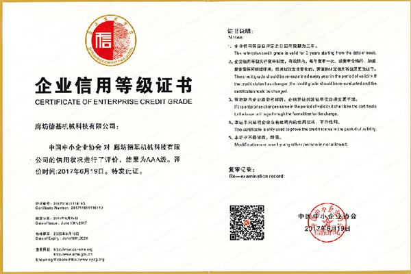 AAA級《企業信用等級證書》的獲得意味著德基機械擁有良好的信用素質、各項經濟指標皆處於較高水平。穩定快速的經營發展使德基機械實力更雄厚,讓每一位購買德基機械產品的用戶沒有後顧之憂。