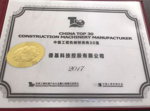 德基機械榮獲“中國工程機械製造商30強”,位居第20位