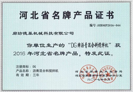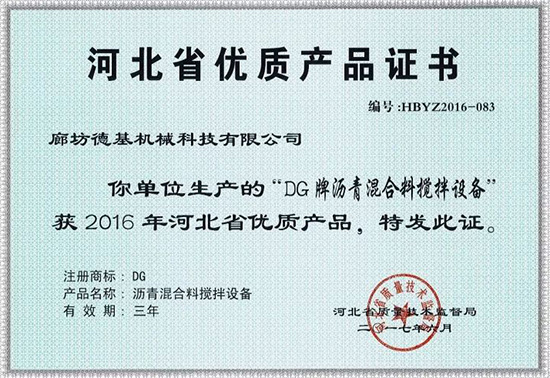 近日經質量技術監督直管部門推薦、第三方專業評價、用戶滿意度調查測評、省質量獎評審委員會審議等程序,河北省質量獎管理委員會授予德基機械瀝青混合料攪拌設備“河北省名牌產品”及“河北省優質產品”稱號。