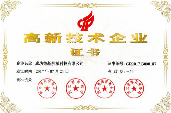 2017年11月27日河北省高新技術企業認定管理工作領導小組公布了《2017年第一批高新技術企業認定名單》(冀高認〔2017〕4號),德基機械再次被認定為“高新技術企業”。
