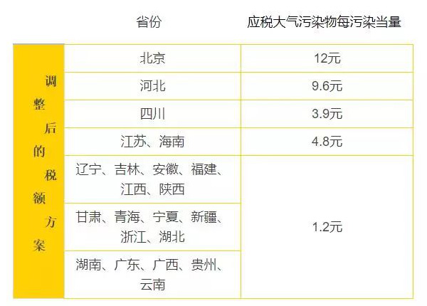 據悉,作為中國第一部專門體現“綠色稅製”、推進生態文明建設的單行稅法,環保稅法規定,應稅大氣汙染物的稅額幅度為每汙染當量1.2元至12元,具體適用稅額的確定和調整,可由各地人民代表大會常務委員會在法定稅額幅度內決定。