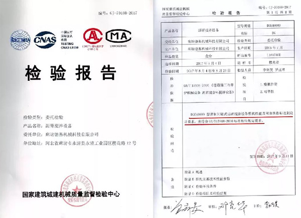 德基機械生產、銷售、投運的DGE係列環保瀝青拌合站全部都通過了當地環保部門的檢測。