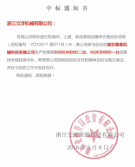 喜報頻傳遞,訂單接踵來!近日,在浙江交通資源投資有限公司瀝青攪拌站項目招標中,德基機械一次中標3台整體式再生設備,刷新國內一次性采購整體式再生瀝青攪拌設備記錄。本次中標的2台DGRE4000D型及1台DGR3000D型,分別用於湖州和浮、紹興上虞、新昌三個高速公路的養護工程及周邊道路建設。