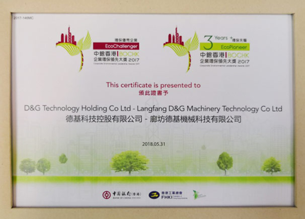 德基科技一向重視環境保護,致力研發具環保及節能功能的瀝青混合料攪拌設備,設備已於17個“一帶一路”沿線國家使用,並於生產和日常運作等方麵切實執行節能減排措施。公司今年再次獲得由香港工業總會和中銀香港共同頒發的“中銀香港企業環保領先大獎2017”的“環保優秀企業”,今年更獲得“3年+參與環保先驅獎章”,以表揚集團在推行環保措施及減少汙染環境方麵的持續努力和成果。