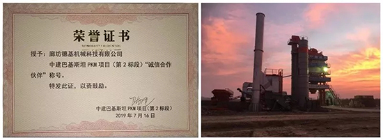 項目正式竣工前,德基機械一舉榮獲中國建築“誠信合作夥伴”的榮譽稱號,這無疑是對德基機械瀝青攪拌設備品質與服務的高度評價。