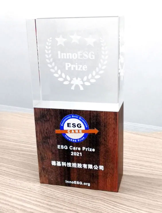 德基科技在INNOESG頒獎典禮上獲InnoESG Care Prize 2021,並表揚了德基機械在可持續發展/環境、社會及管治方麵的表現。