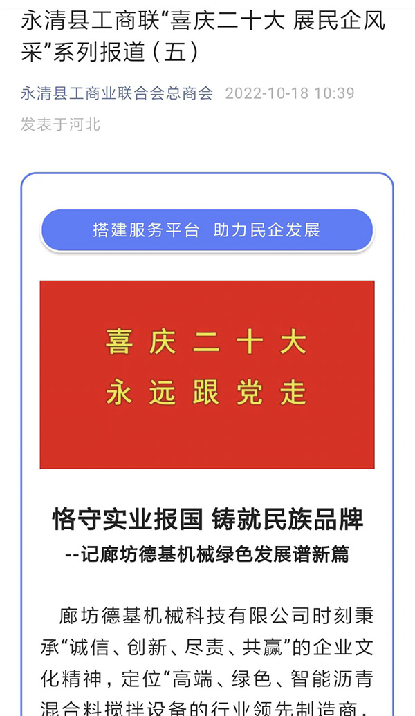 永清縣工商業聯合會總商會對德基機械做了專刊報道,詳細內容請閱讀原文。