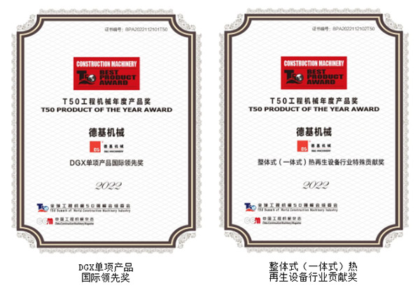 除了入榜“2022年TOP50工程機械應用案例”外,德基機械還榮獲了“DGX單項產品國際領先獎”、“整體式(一體式)熱再生設備行業貢獻獎”。