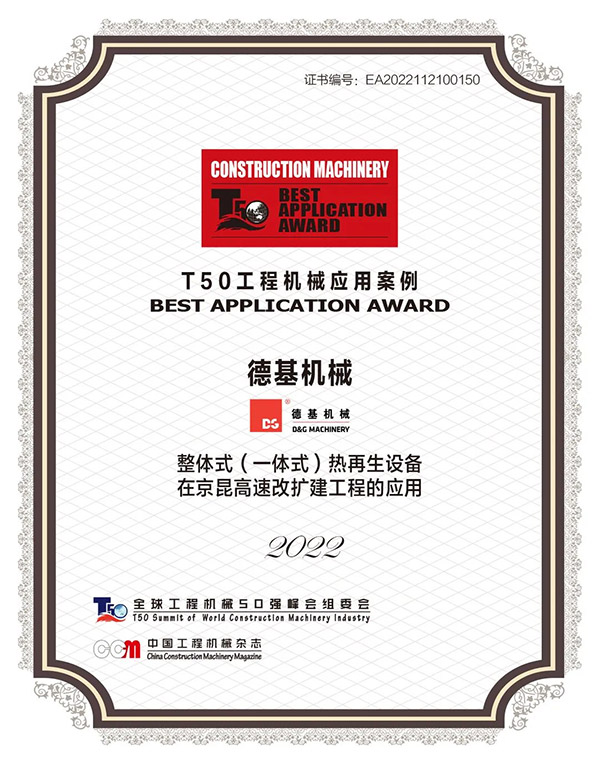 近年來,隨著中國工業技術不斷升級創新,越來越多的高科技、強性能的大國重器登上中國建造的舞台,國內優秀的機械製造商經曆了市場的不斷洗禮後,依然提交上滿分答卷。德基機械成立20餘年間,勵精圖治、不斷探索,研發出更智能更環保更靈活的瀝青攪拌設備,努力終有回報,2022年11月21日,全球工程機械50強峰會隆重發布“2022年TOP50工程機械應用案例”,德基機械連續2年獲獎。
