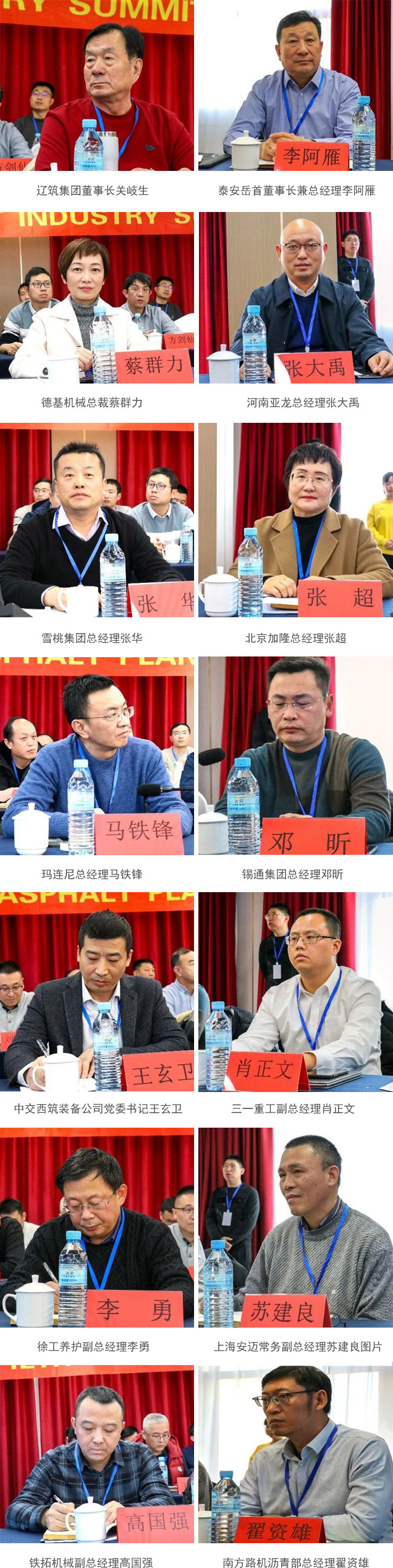 參加本屆峰會的企業領導和代表還有:吉林省公路機械有限公司副總經理田新剛、遼陽築路機械有限公司總工程師沈殿偉、泰安嶽首拌和站設備有限公司副總經理李建民和總經理助理封崇、廊坊德基機械科技有限公司副總裁趙雄誌、無錫錫通科技集團有限公司總經理助理王振華、中交西安築路機械有限公司裝備公司副總經理劉劍、福建省鐵拓機械股份有限公司部門經理潘澤源和王遠航、三一重工股份有限公司攪拌設備公司瀝青所所長劉棟玉、三一路機東北分公司總經理孫作為、福建南方路麵機械股份有限公司瀝青事業部營銷總監劉誌斌、無錫雪桃集團有限公司部門經理錢鑫偉、河南亞龍智能裝備有限公司技術經理陳清信、吉林省公路機械有限公司部門經理王秀麗、中國路麵機械網董事長方劍仙和副總經理馮轉、《建築機械》雜誌社主編李科鋒等。