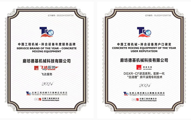 2024全球工程機械50強峰會於11月25日在上海隆重舉行。峰會吸引了來自美國、德國、日本等十多個國家和地區的全球工程機械製造商,全球工程機械零部件供應商等共計600餘位嘉賓出席。大會以“新格局、新挑戰、新未來”,全(quan)麵(mian)探(tan)討(tao)了(le)全(quan)球(qiu)和(he)中(zhong)國(guo)工(gong)程(cheng)機(ji)械(xie)產(chan)業(ye)近(jin)年(nian)來(lai)發(fa)生(sheng)的(de)變(bian)化(hua)以(yi)及(ji)未(wei)來(lai)麵(mian)臨(lin)的(de)機(ji)遇(yu)和(he)挑(tiao)戰(zhan)。德(de)基(ji)機(ji)械(xie)作(zuo)為(wei)行(xing)業(ye)引(yin)領(ling)者(zhe),受(shou)邀(yao)出(chu)席(xi)了(le)本(ben)次(ci)盛(sheng)會(hui),並(bing)斬(zhan)獲(huo)多(duo)項(xiang)大(da)獎(jiang),其(qi)中(zhong)2款產品斬獲“拌合設備年度服務品牌”和“拌合設備用戶口碑獎”明星產品。