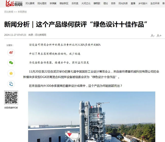 河北日報、河北新聞網等多家媒體對德基機械獲評“綠色設計十佳作品”進行了詳細報道。