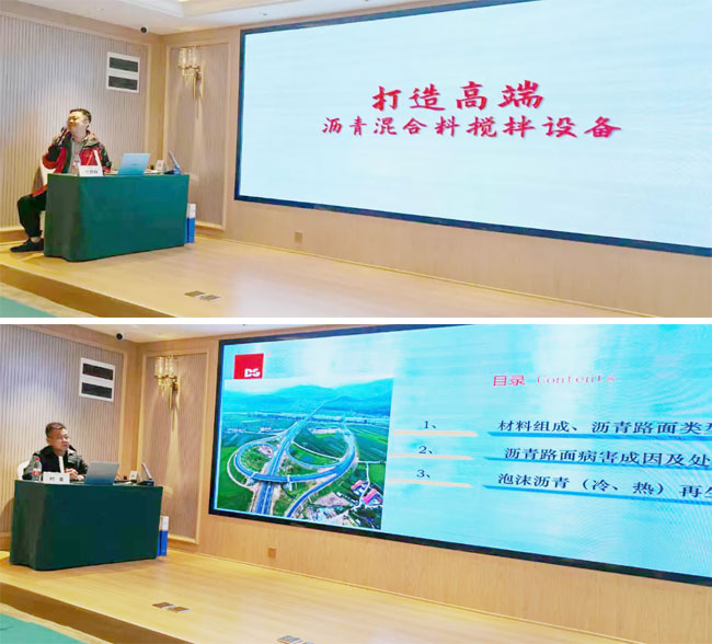 培訓會上,德基機械總設計師於洪林直接切入主題,圍繞瀝青拌合站的選型重點、部件工作原理說明、使用及維修保養注意事項,影響混合料質量的因素、篩網尺寸的選擇、各類環保措施的優缺點展開介紹,沒有花哨的理論,隻有實打實的案例和解決方案。德基機械材料主任工程師時雷作了《瀝青拌合站材料簡析》的(de)主(zhu)題(ti)培(pei)訓(xun),從(cong)客(ke)戶(hu)關(guan)心(xin)的(de)材(cai)料(liao)對(dui)瀝(li)青(qing)混(hun)合(he)料(liao)性(xing)能(neng)的(de)影(ying)響(xiang),如(ru)骨(gu)料(liao)的(de)級(ji)配(pei)如(ru)何(he)影(ying)響(xiang)路(lu)麵(mian)的(de)強(qiang)度(du)和(he)耐(nai)久(jiu)性(xing),改(gai)性(xing)劑(ji)如(ru)何(he)提(ti)高(gao)高(gao)溫(wen)或(huo)低(di)溫(wen)性(xing)能(neng)以(yi)及(ji)摻(chan)配(pei)後(hou)的(de)性(xing)能(neng)變(bian)化(hua)等(deng)方(fang)麵(mian)內(nei)容(rong)展(zhan)開(kai)。