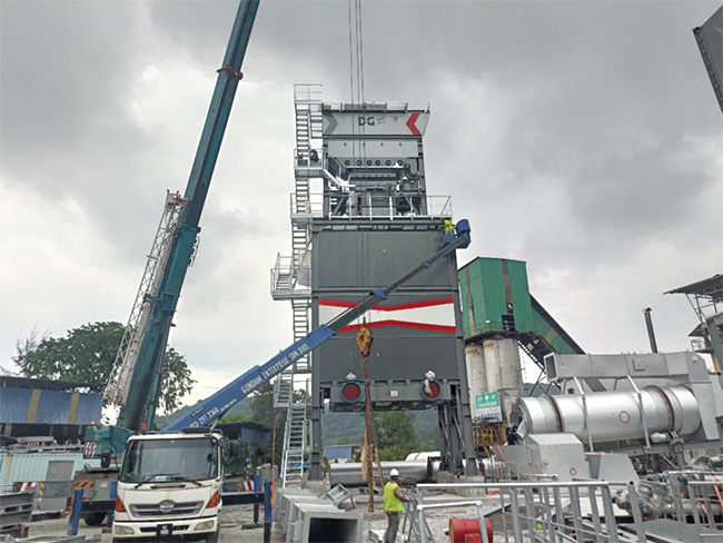 一台DGXR3000D整體式再生瀝青攪拌站目前正在主樓吊裝,預計投產後服務於馬來西亞當地道路項目。