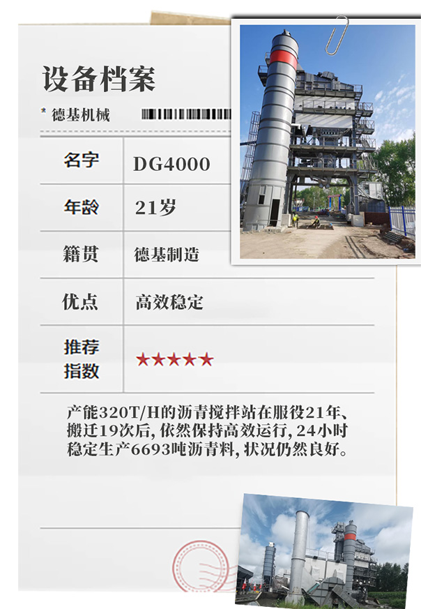 在(zai)工(gong)程(cheng)機(ji)械(xie)領(ling)域(yu),設(she)備(bei)的(de)可(ke)靠(kao)性(xing)與(yu)耐(nai)久(jiu)性(xing)是(shi)衡(heng)量(liang)品(pin)牌(pai)價(jia)值(zhi)的(de)重(zhong)要(yao)標(biao)準(zhun)。近(jin)日(ri),一(yi)位(wei)黑(hei)龍(long)江(jiang)用(yong)戶(hu)的(de)真(zhen)實(shi)留(liu)言(yan)再(zai)次(ci)印(yin)證(zheng)了(le)德(de)基(ji)機(ji)械(xie)瀝(li)青(qing)攪(jiao)拌(ban)站(zhan)的(de)卓(zhuo)越(yue)品(pin)質(zhi)——一台DG4000型,產能320t/h的瀝青攪拌站在服役21年、搬遷19次後,依然保持高效運行,24小時穩定生產6693噸瀝青料,狀況仍然良好,證明了設備全生命周期的價值。