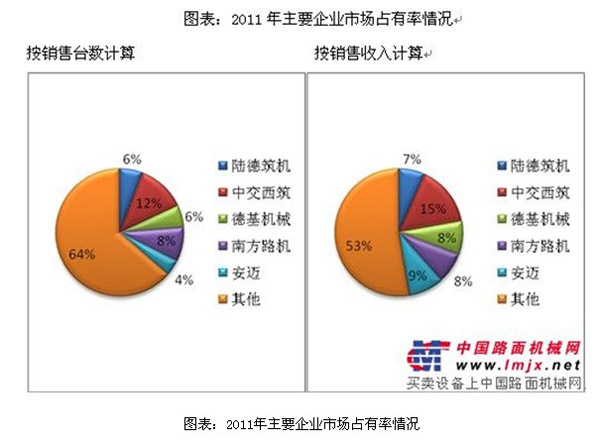 目前,國內瀝青攪拌設備的生產企業中,除安邁、瑪連尼、日工等外資品牌在國內投資建立的企業外,中交西築、德基機械、陸德築機、南方路機等優勢企業憑借其產品的先進技術、可靠性與穩定性等優勢,占據較大市場份額。2011年按銷售台數與銷售收入占比來看,市場排名前五的企業為中交西築、南方路機、陸德築機、德基機械以及安邁。