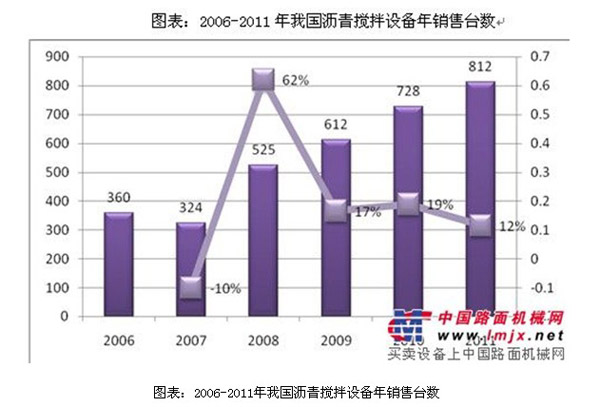 據中國工程機械工業協會統計年鑒顯示,2006年至2011年,我國瀝青攪拌設備的年銷售量從360台增長至812台,年均增長率約18%。這期間,由2007年4月美國次貸危機引發的全球金融危機對本行業的發展造成極大的衝擊,2007年行業銷售增長率出現負值。隨著2008年底國家4萬億經濟刺激計劃的出台,對國內基礎設施,尤其是鐵路、公路等重大基礎設施建設起到極大的推動作用。485億元的公路建設投資帶動了我國瀝青攪拌設備的爆發式增長。