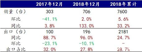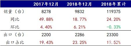 裝載機2018年全年累計銷售11.9萬台,大幅增長。2018年12月份,納入統計的國內25家主要裝載機生產企業合計銷售裝載機9832台,同比增長18.8%。12月份裝載機出口2286餘台,同比微增3.9%。2018年以來,裝載機累計銷量達到11.9萬台,同比增長24.2%。全年僅2月份和9月份銷量同比下滑,行業持續增長勢頭。
