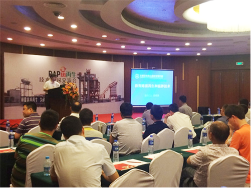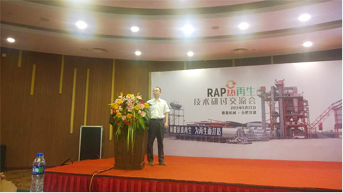 會議由德基機械營銷中心常務副總經理李彤先生為大會致辭。首先由交通部公路科學研究院黃頌昌教授向與會來賓介紹“國內外瀝青再生技術的現狀及發展”。隨後,德基機械研發中心副主任於洪林先生就“RAP熱再生”做了專題報告,重點介紹了德基機械的“整體式瀝青混合料攪拌設備”(下稱“整體式設備”)。該“整體式設備”摒棄拚湊再生功能的傳統思路,將再生作為攪拌設備的標準配置,是專為再生而生的瀝青攪拌設備。在設計理念上,“整體式設備”的拌鍋位於設備的中間位置,確保生產所需回收料和新骨料均可由各自的計量鬥直接進入拌鍋,此外,相對於常規攪拌設備,“整體式設備”采用了大一號的拌鍋,即在延長攪拌時間的情況下也能保證設備的產量。