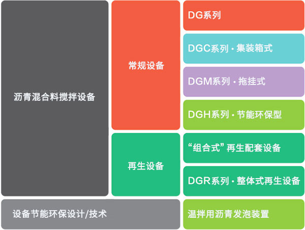 德基機械已經具有完善的產品線,為客戶提供各種規格的瀝青混合料攪拌設備,包括常規瀝青混合料攪拌設備(成品倉旁置∕底置)、集裝箱式瀝青混合料攪拌設備、組合式再生瀝青混合料攪拌設備以及新研製的整體式再生瀝青混合料攪拌設備。設備可使用柴油、重油、天然氣、煤粉作為燃料,完善的產品線為客戶多種選擇方案,滿足各種工程需求。