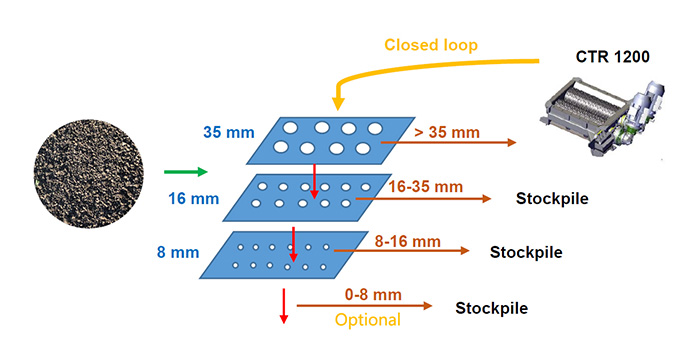 針對銑刨料中已含有大量細料,故RAP齒輥破碎篩分設備采用先篩分後破碎的工藝流程,即對銑刨料先進行篩分,將超規格料進行破碎並再次篩分的閉環工藝流程。
