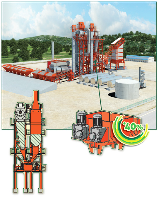 ● 拌合樓整體重新設計 采取“整體式”設計,將再生作為一台攪拌設備的“標準配置”,是整套設備不可或缺的組成部分。